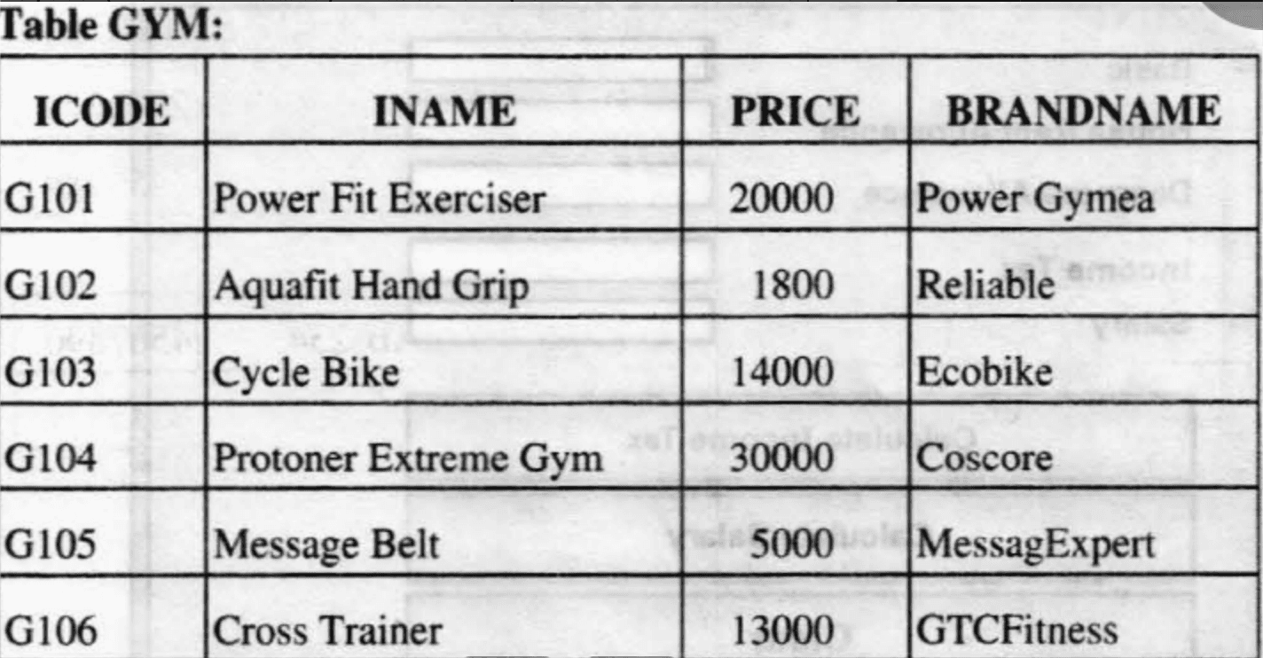 - Consider the following table named "GYM" with details about fitness items being sold in the store. Write command of SQL for (i) to (ii).